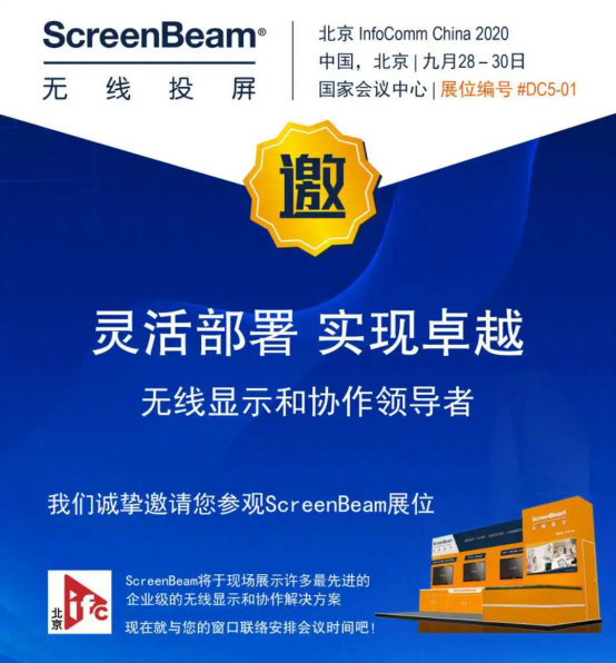 9月28-30日,2020北京國(guó)際視聽(tīng)集成設(shè)備與技術(shù)展(InfoComm China 2020)將在北京國(guó)家會(huì)議中心展開(kāi)。全球無(wú)線(xiàn)會(huì)議協(xié)作解決方案提供商ScreenBeam Inc. (勝屏信息技術(shù)有限公司以下簡(jiǎn)稱(chēng)勝屏公司或ScreenBeam)作為參展單位將在本次展會(huì)上亮相,展示旗下最新無(wú)線(xiàn)投屏解決方案以及不同的應(yīng)用場(chǎng)景,為觀展者呈現(xiàn)復(fù)工防疫后更安全智能的會(huì)議空間。